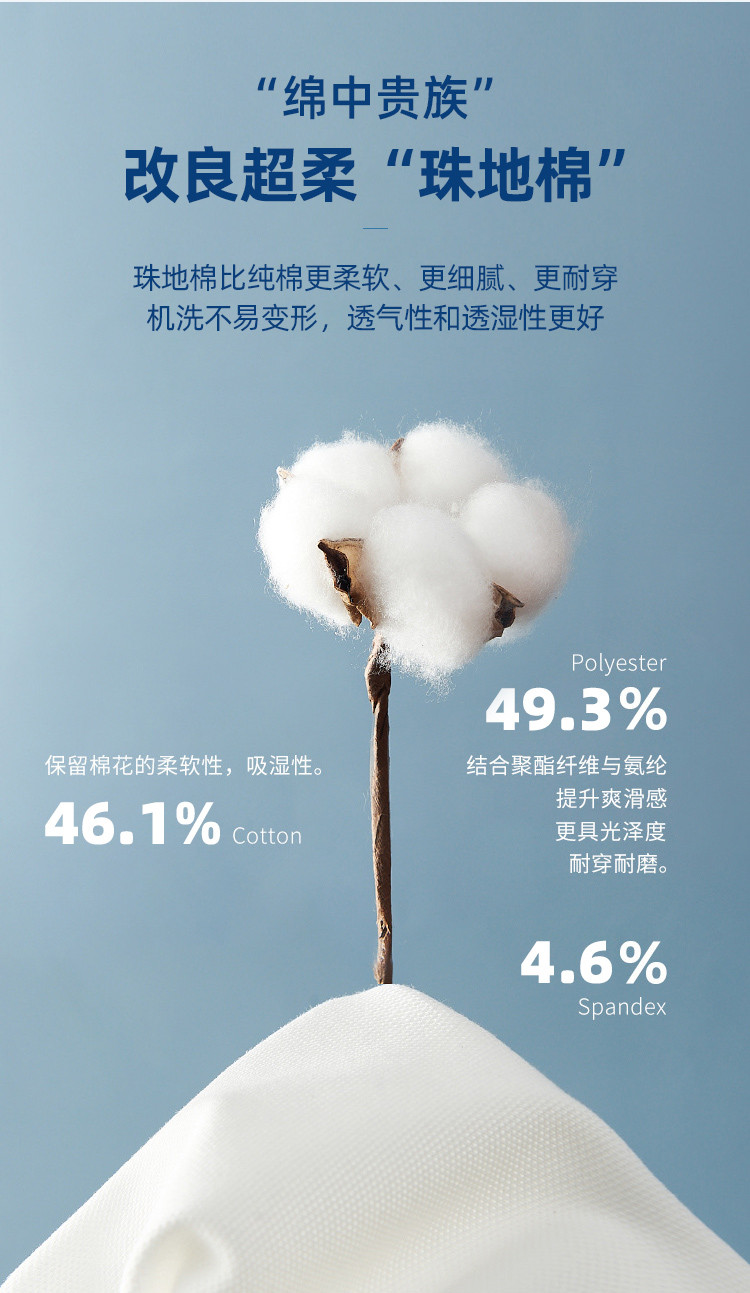 材质材质:49.3%聚酯纤维46.1%棉4.6%氨纶